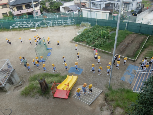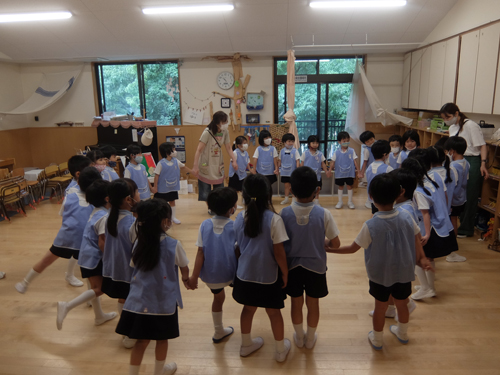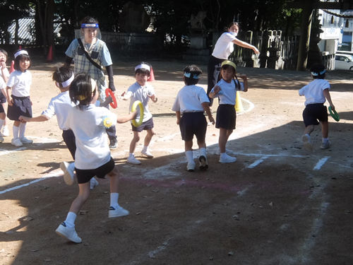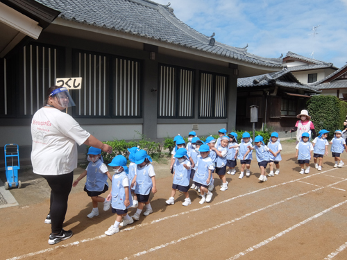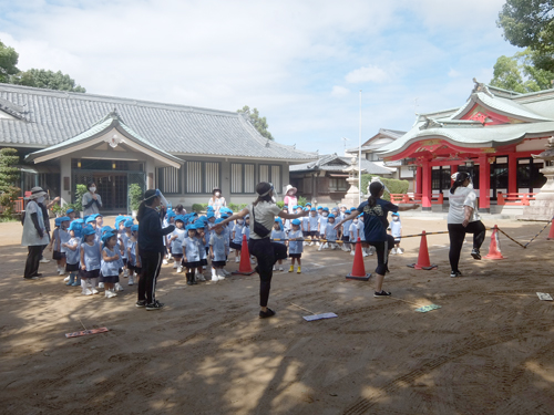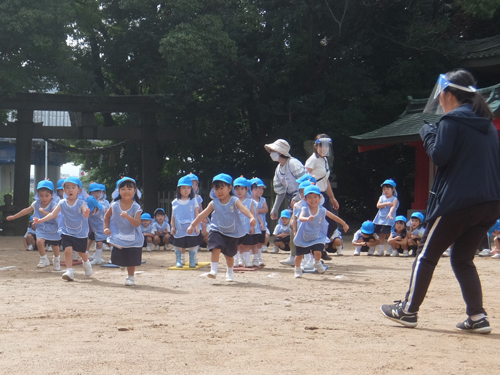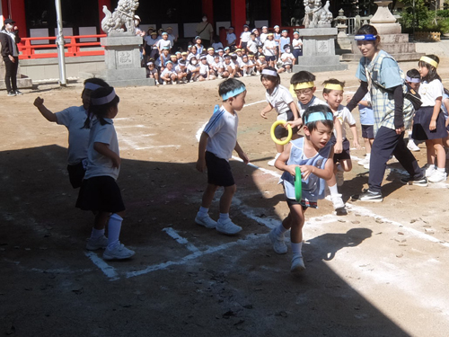 年長さんは体育遊びの日です。残念ながら雨天なので土の入った境内では活動できませんでしたが、いろいろ志向を変えてリレーを楽しんでいました。