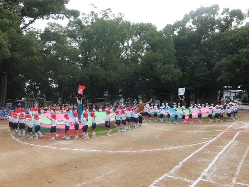 プログラム1番は「みんなの力で火をともせ。~カメリンピック開幕~」と称して、2クラスずつの2グループ対抗で団体競技をしました。