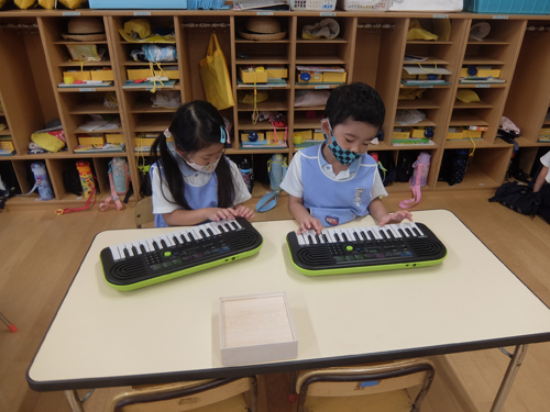 今は鍵盤ハーモニカの使用を控えている代わりに、自動で音の出る鍵盤楽器で遊ぶ姿があります。
