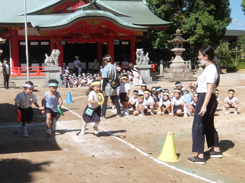 今日は晴れ間も覗き良いお天気になってきたので、年少さんが初めて土の入った境内で運動会へ向けての活動をしました。