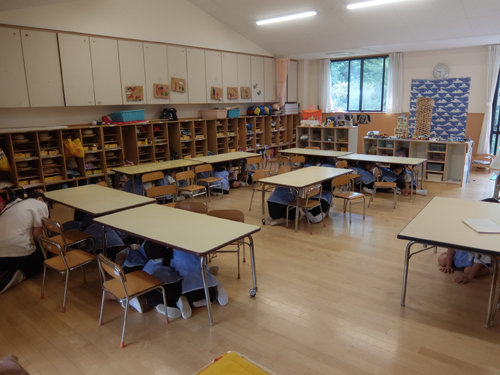 「地震です。安全な場所で揺れが収まるのを待ってください。」の放送があり、机が出ているクラスは机の下に、机がなくても蛍光灯の下は避けて待機です。