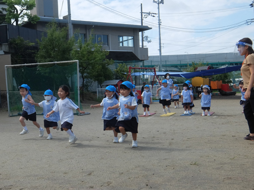 年長さんは園庭でクラスごとにリレーの練習をしました。