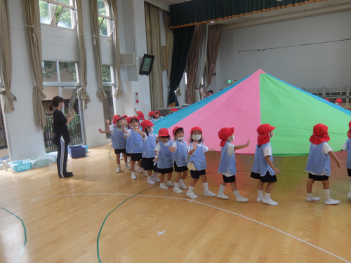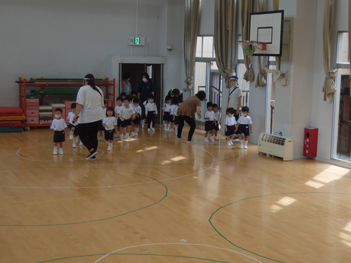 今日は年少さんは体育館でリズムダンスをしました。これは入場方法の確認をしているところです。