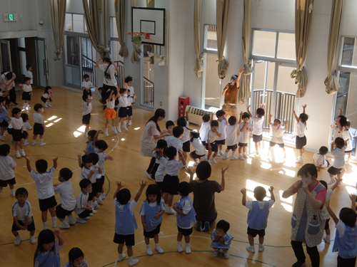 今日は年少さんは体育館でリズムダンスをしました。これは入場方法の確認をしているところです。