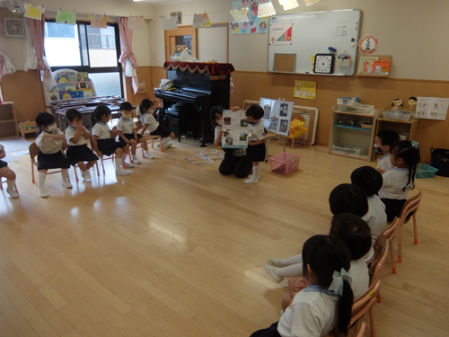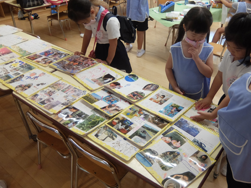 お部屋に戻ってからは、夏のおもいでの写真や絵を見てもらいながら、夏休みの経験発表をしていました。
