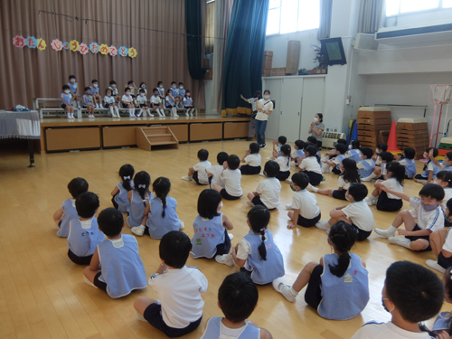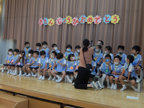 誕生児さんは舞台に上がり、一人ずつ自分のクラスと名前を言い、みんなで拍手でお祝いをしました。