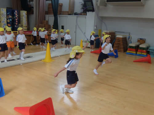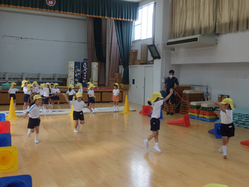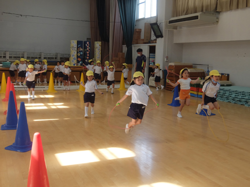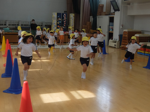 今日は年長さんの体育遊びの日です。縄跳びを使って身体を動かしました。
