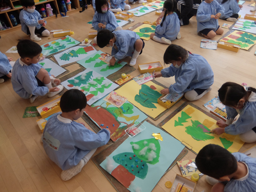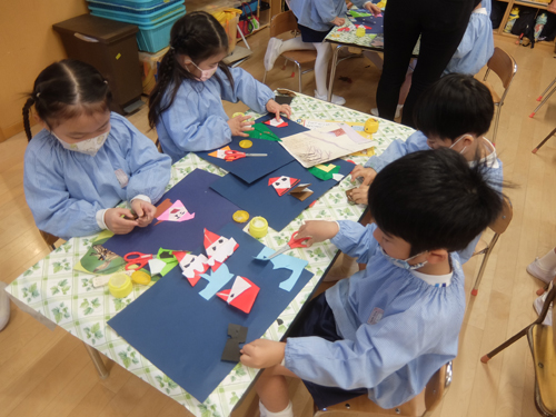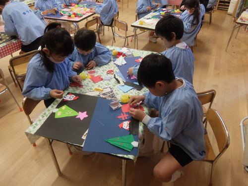 年長さんは先日折った折り紙の貼り絵でクリスマスを表現していました。