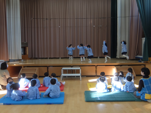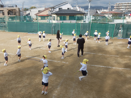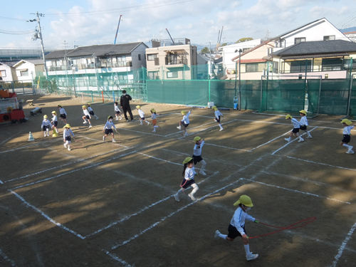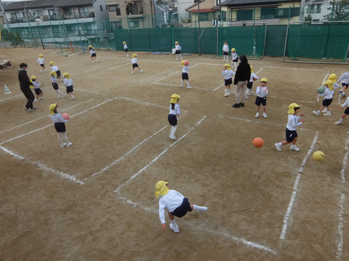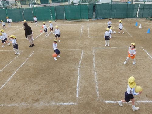 今日は天気も良かったので、年長さんの体育遊びを園庭で行いました。