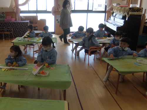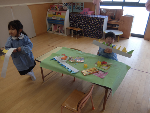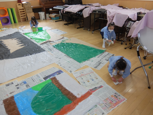 年中さんは劇遊びで使うバック絵を大きな紙に描いていました。