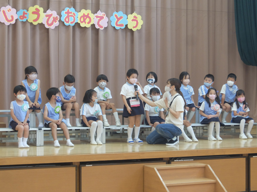 誕生児さんは舞台に上がり、一人ずつ自分のクラスと名前を言い、みんなで拍手でお祝いをしました。