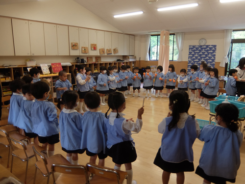 年中さんはいろいろな楽器で遊んでみました。楽器ごとに鳴らした後、