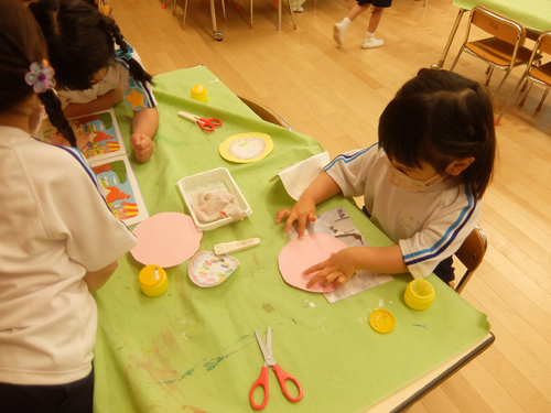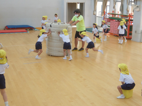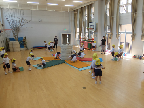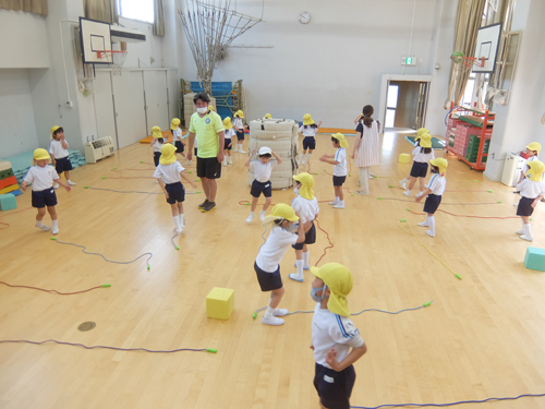 年長さんは毎週の体育遊びです。ジャンプしながら手足を動かしたり、