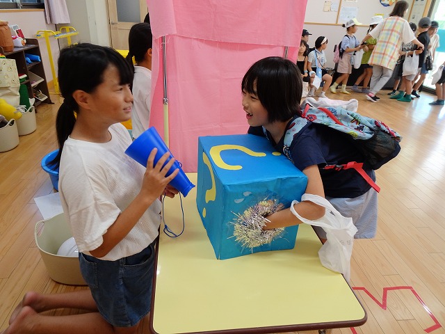 牛乳パックやトイレットペーパーの芯、新聞紙に段ボール、毛糸やお肉のトレイと色々な廃品を使った、素敵なお店屋さんができました!!