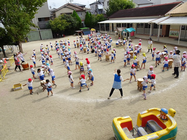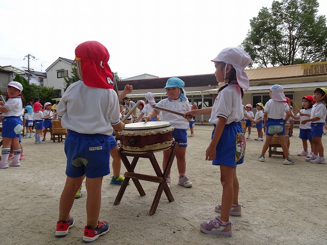 憧れの太鼓を年長さんと一緒にたたきました!!