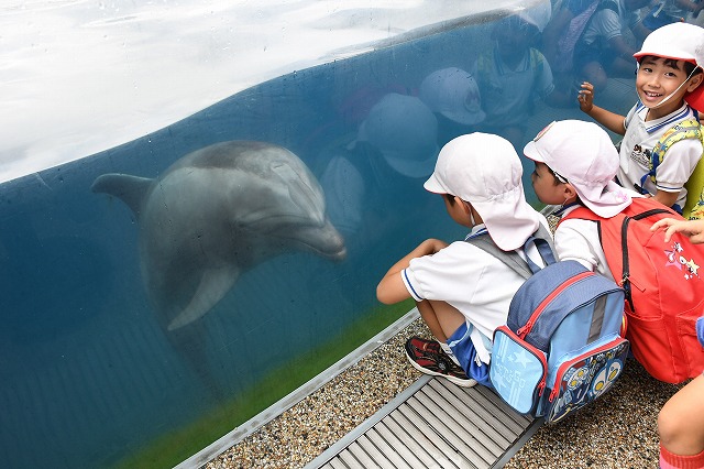 初めに「イルカスタジアム」に行って、イルカのジャンプや水中を泳ぐ様子、ステージの上で上手に回転する姿をみました。