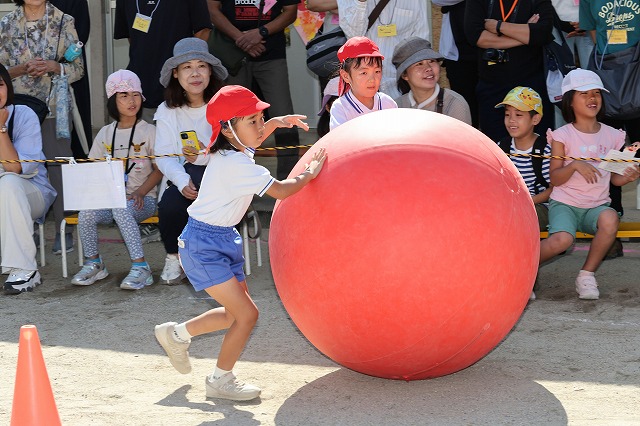 大きな大玉を2人組で転がし、クラスみんなで次の走者に!!